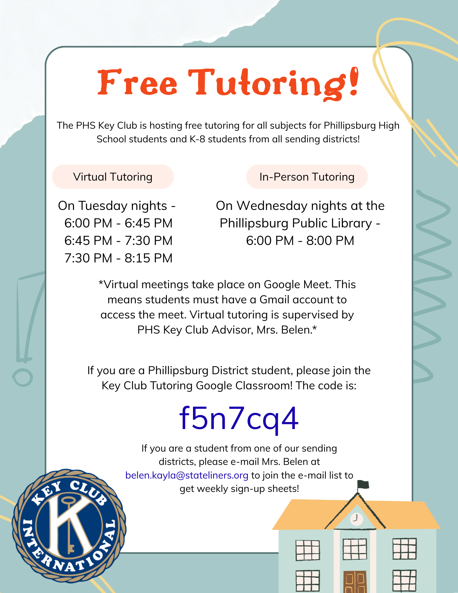 The PHS Key Club will be offering FREE Tutoring for the 2025-2026 school year. Virtual tutoring will be held on Tuesday nights from 6:00-8:15pm via google meet, and in-person tutoring will be held on Wednesday nights from 6:00-8:00pm at the Phillipsburg Free Public Library.